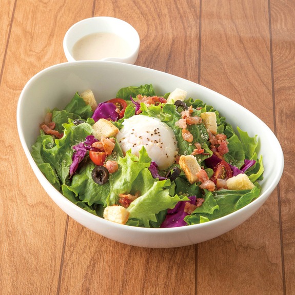 写真のメニューは「温泉卵のシーザーサラダ」です。フレッシュなサラダのうえに半熟玉子をトッピングし、シーザーサラダドレッシングをかけていただく一品。玉子を割ると、とろりとした黄身が野菜に絡み、コクのある味わいに変化します。